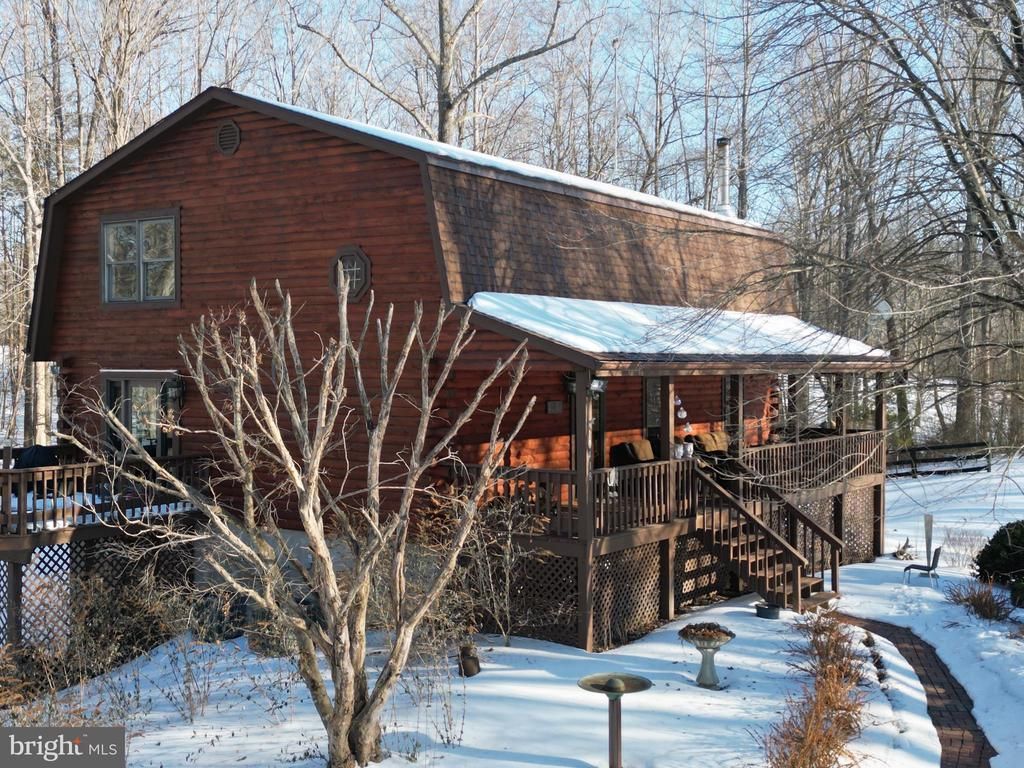 *VA 2.2% Assumable Loan Available* Low Energy Bill- Avg $158/month*2,973 sqft of Living Space*Lower Level Suite with Full Kitchen, Bath, Living Room, Bedroom and Private Walk Out Entrance! Nestled in a serene rural setting, this beautifully renovated log home offers the perfect blend of rustic charm and modern comfort on 8.16 private acres with 2,973 square feet of living space. Major updates including new roof(s), freshly stained exterior logs on both the home and garage, fireplace lining, main level luxury bathroom with custom vanity, and other updates have transformed the home into a warm, inviting retreat featuring soaring two-story ceilings, exposed wood beams, and hardwood flooring. The open living area flows into a kitchen with granite countertops and deck access—ideal for entertaining or enjoying peaceful country views. A main-level bedroom provides easy one-level living, while two additional bedrooms are located upstairs. The fully finished walkout lower level offers a private in-law suite with separate entrance, complete with a full kitchen, full bath, bedroom, and spacious living and dining area—perfect for guests or multi-generational living. Outside, enjoy a full covered front porch overlooking neighboring open pasture, abundant wildlife, and scenic vistas, along with the soothing presence of a nearby creek. The level, partially cleared land includes a fully fenced flat acre ideal for animals, with access to walking paths, and riding trails. A detached oversized garage with large overhang provides ample storage or animal shelter. Located on a no-thru street with a private driveway and abundant gardens, this property delivers true peace and quiet while remaining conveniently accessible to nearby amenities. This is more than a home—it’s a lifestyle defined by space, privacy, and timeless country living.