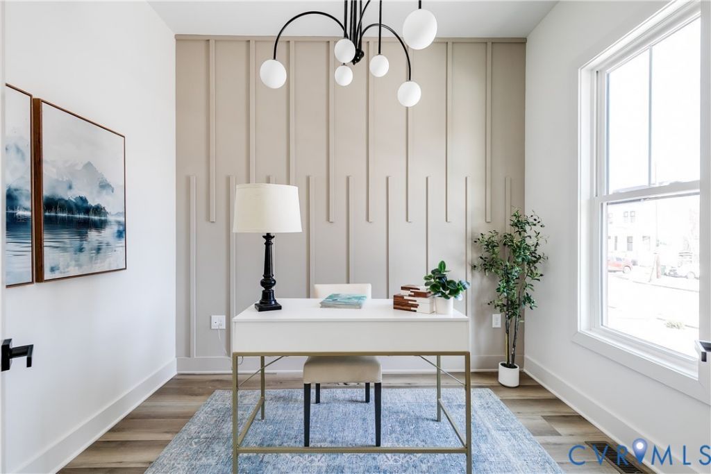 From the moment you enter, the dramatic foyer sets the tone-anchored by a breathtaking cascading light fixture that draws the eye upward and accentuates the home's soaring ceiling heights. An attractive accent wall along the staircase adds architectural interest and a refined design element, while open, airy spaces unfold effortlessly, filled with natural light and complemented by curated statement lighting throughout. The main level offers a seamless flow designed for both sophisticated entertaining and comfortable everyday living. The kitchen features stone countertops, light cabinetry, and a striking slate grey backsplash that creates a beautiful contrast. An inviting eat-at bar keeps the space connected and functional. The sitting area/living room showcases a sleek fireplace framed by modern shelving, offering a warm yet contemporary focal point. A dedicated first-floor office provides the perfect work-from-home retreat, along with a stylish powder room for guests. Upstairs, a generous loft with its own fireplace offers flexible living space-ideal as a secondary lounge or media room. The primary suite, privately situated at the rear of the home, opens to a balcony for quiet mornings or evening relaxation. The primary bath is equally impressive, featuring a large, beautifully tiled shower, double vanity, and elegant finishes that elevate the everyday. Two additional bedrooms and a well-appointed hall bath complete the second floor. For those ready to leave behind the maintenance demands of an older home and embrace the ease of newer construction-with the convenience of an attached garage and minimal yard work-this residence delivers exceptional city living. Ideally located near VCU and the energy of Downtown Richmond, 2120 Lamb Avenue offers style, simplicity, and sophistication in one exceptional address.
