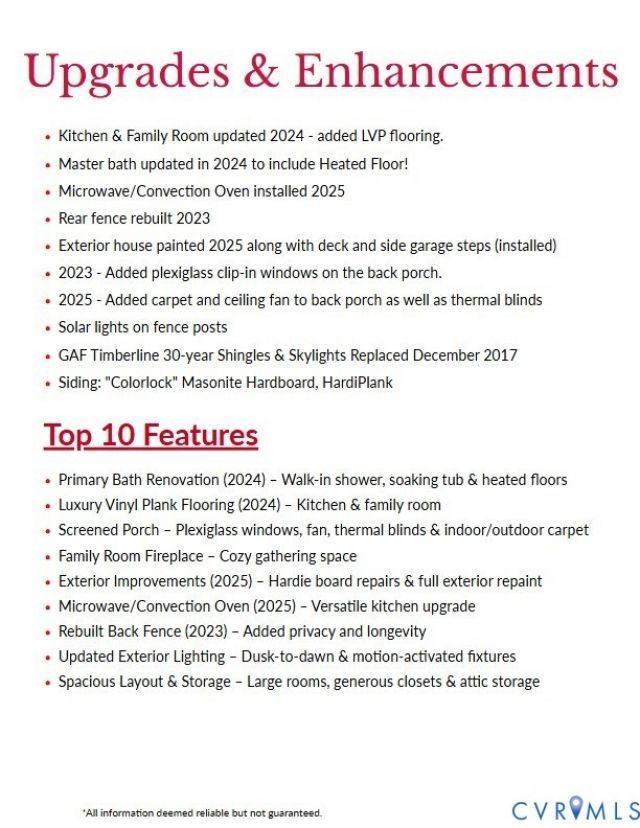 Well-Maintained Home - Well Loved inside and out! Located on a culdesac. Original Owners made numerous thoughtful updates and ensured this house 'kept up with the times,' and today's relaxed lifestyles with the love and need for 'the newest and the best!' The layout of this home is so accommodating with its Transitional layout and flow. Purposeful, yet there is an opportunity in each room to determine the best and most desired use of every nook and amenity! From the moment you enter, you'll be welcomed! Hardwood floors and custom design features are standouts in the front reading room. So very warm and inviting! Newer 'Board & Batten' detailing, as well as newer fixtures, and a vessel sink. The formal Dining Room is located on the rear of the home, with white chair railing and white painted crown moulding. Great kitchen with solid surface countertops, DBL SS sink overlooks back yard, a chair level counter that will accommodate 3 or more barstools and Pantry. Easy access to the rear deck from the Gathering Rooms! Great Room has brick wood burning FP with a raised brick hearth. Upstairs will wow you! A Primary Bathroom renovated in 2024 features ceramic and heated tiled floors, A full glass surround shower- walk-in- roll-in entry. Wait! There's more! You'll love soaking all the cares of the day away in this gorgeous Soaking Tub! - It is as wonderful as it is pretty for those tired, aching backs! If a nightly trip to the 'loo' is required, you are met with warmth from the tiled, heated floors! Oh my stars! Your new bedroom suite is truly a private retreat! Worry Free - the hall bathroom is also updated! Tiled floors & tiled tub surround. Remaining 3 bedrooms are all well sized and have newer WW carpet & neutral painted walls. Walk-In Attic access in addition to ample garage area. Outdoor ambiance with Solar fence lights and unmatched enjoyability!